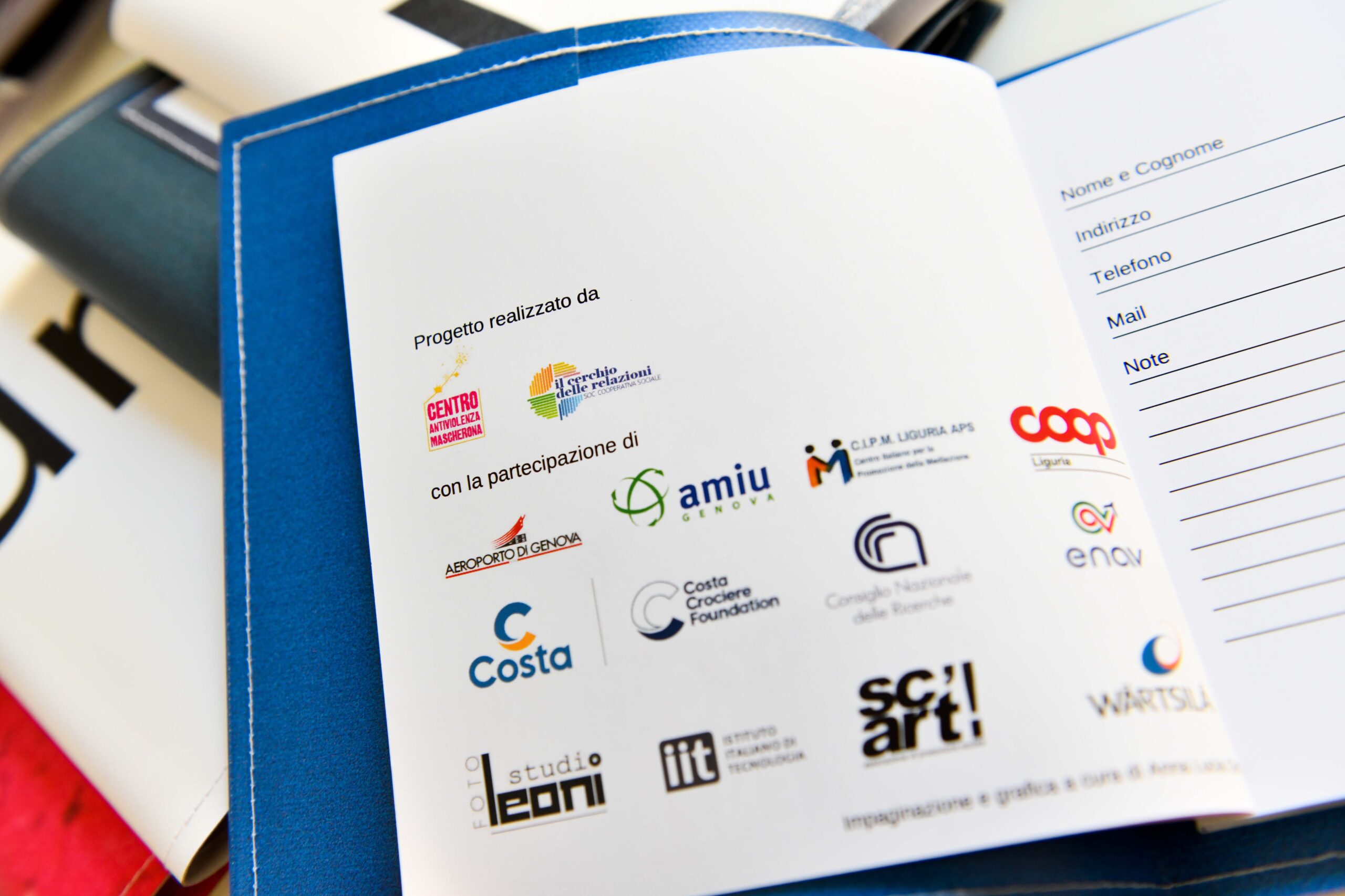 Si conferma e si rafforza la connessione e la vicinanza tra il Centro Antiviolenza Mascherona e Sc’Art – Creazioni al Fresco due realtà che si muovono e operano in contesti differenti in cui le donne sono al centro. “La collaborazione è attiva dal 2019 – afferma Emanuela Musso, coordinatrice progetto e direttrice artistica di Sc’Art Creazioni al Fresco – grazie al progetto “Ponte per l’autonomia”, che propone all’interno della sezione femminile della Casa Circondariale di Genova Pontedecimo, un percorso di supporto, sostegno ed emancipazione, rivolto a donne vittime di violenza. L’attività dello sportello di ascolto e supporto psicologico si intreccia con l’attività del laboratorio, contesto in cui attraverso la manualità e la creatività si acquisiscono competenze sartoriali, diventando parte attiva di un processo di ricostruzione della propria autonomia economica.” E proprio all’interno di questi laboratori sono state realizzate le copertine delle agende riciclando il pvc degli striscioni pubblicitari dismessi.